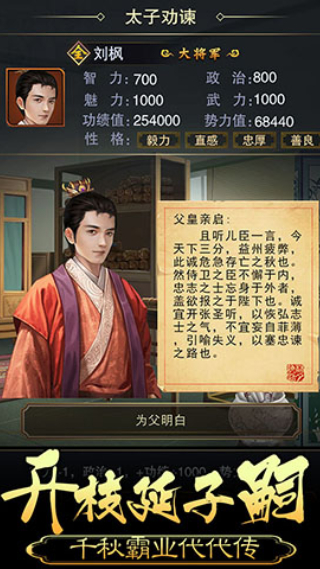 皇帝成长计划2是一款基于古代宫廷的角色扮演游戏,在游戏中玩家扮演着不同朝代的皇帝的角色,你需要利用自己的智慧来改进自己国家的状态,让其能够往好的方向进行发展,对国家的各种事务进行处理的过程当中,还会发生各种随机事件,需要谨慎的应对。